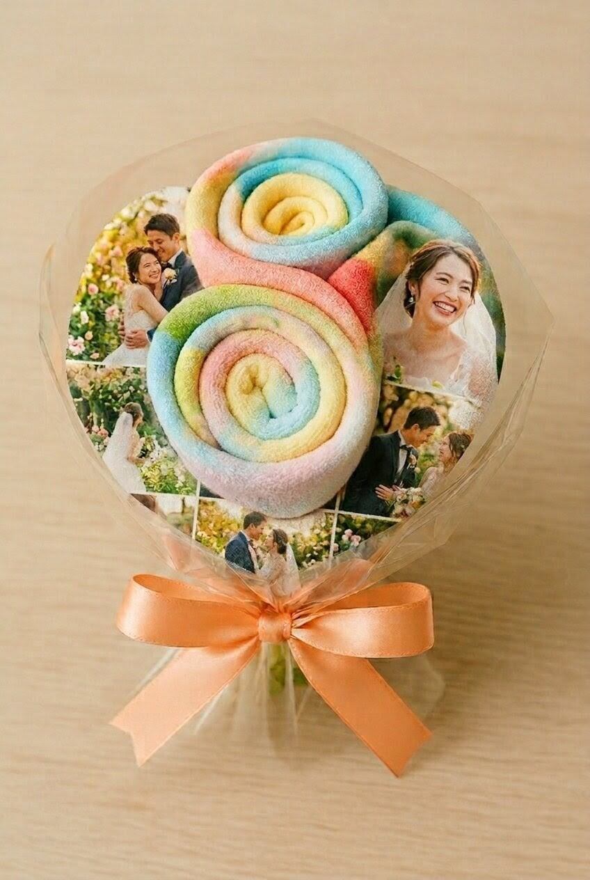 心温まる思い出を形に!オリジナルハンドタオルFLOWERはいかがでしょうか?当商品は、お客様のスマホデータを元にしたオリジナルのハンドタオルを、豪華なバラのブーケのように仕上げる印象的なアイテムです。